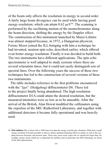 The construction of this instrument launched by Maier-Lebnitz was almost stopped because, in 1972, a Hungarian physicist, Ferenc Mezei joined the ILL bringing with him a technique he had invented, neutron spin echo, described earlier, which offered even better energy resolution. Finally it was decided to build both. The two instruments have different applications. The spin echo spectrometer is well adapted to study systems where there are several relaxation times, but it could not easily distinguish sets of spectral lines. Over the following years the success of these two techniques has led to the construction of several versions of these two instruments.
