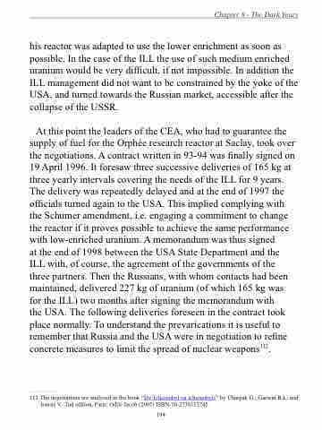 at the end of 1998 between the USA State Department and the ILL with, of course, the agreement of the governments of the three partners. Then the Russians, with whom contacts had been maintained, delivered 227 kg of uranium (of which 165 kg was for the ILL) two months after signing the memorandum with the USA. The following deliveries foreseen in the contract took place normally. To understand the prevarications it is useful to remember that Russia and the USA were in negotiation to refine concrete measures to limit the spread of nuclear weapons112.