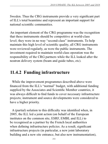 level; they were in no way “second-class” instruments. To help maintain this high level of scientific quality, all CRG instruments were reviewed regularly, as were the public instruments. The investment required to maintain world-class operation was the responsibility of the CRG partners while the ILL looked after the neutron delivery system (beam and guide tubes, etc).