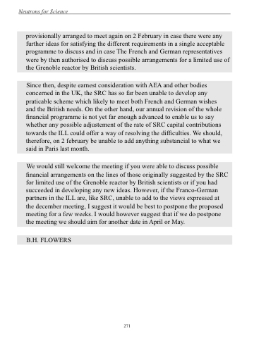We would still welcome the meeting if you were able to discuss possible financial arrangements on the lines of those originally suggested by the SRC for limited use of the Grenoble reactor by British scientists or if you had succeeded in developing any new ideas. However, if the Franco-German partners in the ILL are, like SRC, unable to add to the views expressed at the december meeting, I suggest it would be best to postpone the proposed meeting for a few weeks. I would however suggest that if we do postpone the meeting we should aim for another date in April or May.