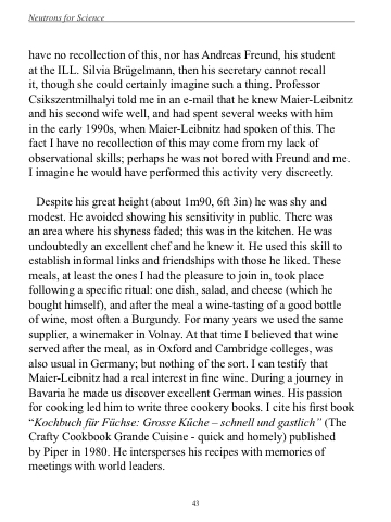 of wine, most often a Burgundy. For many years we used the same supplier, a winemaker in Volnay. At that time I believed that wine served after the meal, as in Oxford and Cambridge colleges, was also usual in Germany; but nothing of the sort. I can testify that Maier-Leibnitz had a real interest in fine wine. During a journey in Bavaria he made us discover excellent German wines. His passion for cooking led him to write three cookery books. I cite his first book “Kochbuch für Füchse: Grosse Kűche – schnell und gastlich” (The Crafty Cookbook Grande Cuisine - quick and homely) published