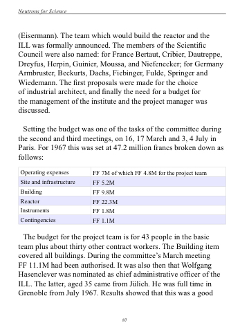 The budget for the project team is for 43 people in the basic team plus about thirty other contract workers. The Building item covered all buildings. During the committee’s March meeting FF 11.1M had been authorised. It was also then that Wolfgang Hasenclever was nominated as chief administrative officer of the ILL. The latter, aged 35 came from Jülich. He was full time in Grenoble from July 1967. Results showed that this was a good