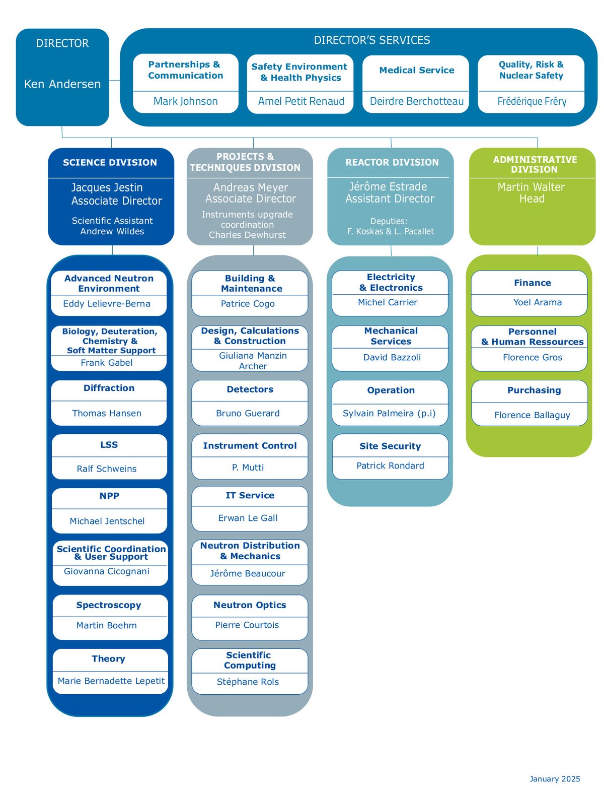 Le Comité de Direction de l'ILL (Management Board) est présidé par le Directeur de l'ILL et assure le fonctionnement efficace de l'installation, notamment la collaboration et la communication entre les Divisions. Il conseille le Directeur sur les questions principales affectant l'ILL, ce qui inclut, le programme scientifique et instrumental annuel et pluriannuel, les technologies afférentes, le calendrier de fonctionnement du réacteur, le développement du personnel, les collaborations et contrats majeurs, les aspects financiers (budget annuel et prévisions pluriannuelles), et la préparation du Comité de Pilotage (Steering Committee). En cas d'absence, le Directeur délègue ses pouvoirs à l'un des autres membres du Comité de Direction.