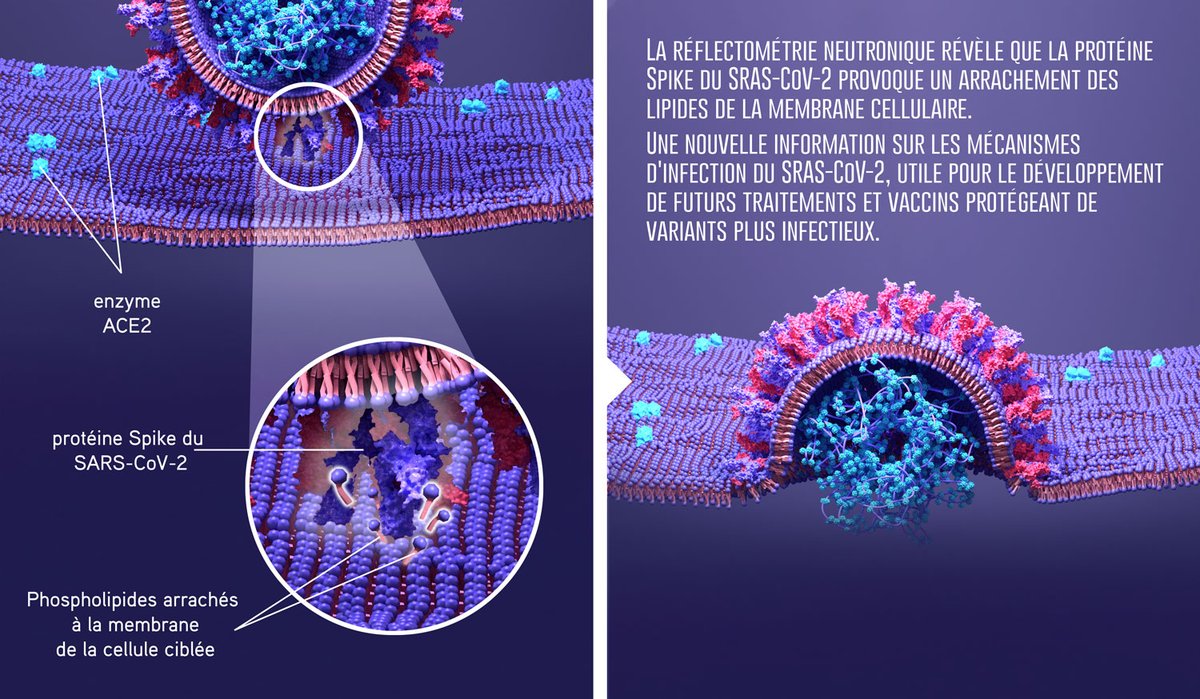 La réflectométrie neutronique révèle que la protéine Spike du SRAS-CoV-2 provoque un arrachement des lipides de la membrane cellulaire. Une nouvelle information sur les mécanismes d'infection du SRAS-CoV-2, utile pour le développement de futurs traitements et vaccins protégeant de variants plus infectieux.