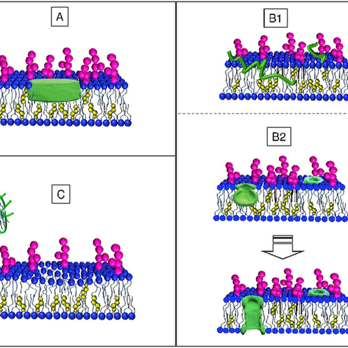 It was observed that structured oligomers are embedded as such in the outer leaflet of the membrane where they can constitute a seed for further Aβ addition and elongation. Reversely, it was found that early labile oligomers, easily dissolving to monomers, are captured by the membrane and deeply dig it towards the opposite side – this observation that there is an eventual deeper impact of monomers as compared to oligomers is surprising based on current concepts. This profile suggests that Aβ organization, starting from enclosed monomers, is templated by the membrane into a forming pore.