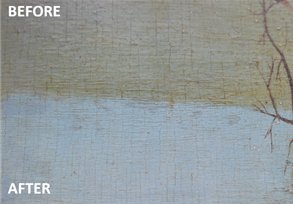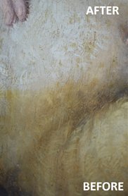 A critical task in the restoration consists of removing the damaged or opaque outer part of the varnish film, and replacing it with fresh, transparent varnish. Commonly, the restorer will use a swab soaked with solvent to transfer the solution to the painting’s film and remove the outer part of this old varnish with the swab, using minimal shear.