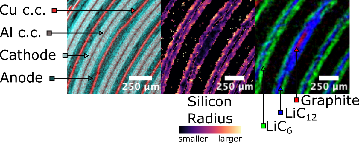 Certaines parties sélectionnées de la cellule ont ensuite été examinées plus en détail à l’aide de différentes techniques de tomographie à rayons X sur les lignes de lumière à haute énergie de l’ESRF. L'acquisition de données pendant le processus de charge de la batterie (une expérience dite operando) a permis de recueillir davantage d'informations sur la dynamique de réaction dans les zones défectueuses : la diffusion du lithium y est partiellement bloquée, et même lorsque la majeure partie de la cellule est complètement chargée, ces zones restent dépourvues de lithium en leur centre.