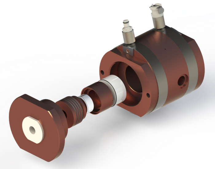 This 300 MPa (3 kbar) cell was designed within the framework of NMI3-II. The prototype is essentially made from hardened CuBe alloy and Sapphire windows. It is optimised for SANS and features a very low background and almost 90% transmission at 6Å. The sample thickness varies between 0.5 and 2 mm and the temperature is controlled with a thermostatic bath (±10 mK stability). The prototype cell was tested successfully on D11 in June and July 2015 and several versions are being manufactured: