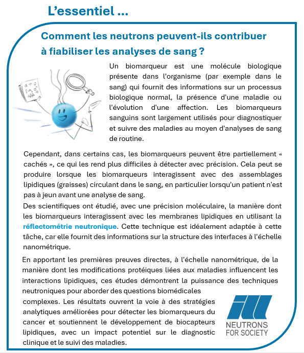 Les biomarqueurs sanguins sont couramment utilisés pour diagnostiquer et suivre des maladies via de simples prises de sang. Cependant, dans certains cas, ils peuvent être partiellement « cachés », rendant leur détection précise plus complexe. Des scientifiques ont étudié, avec une précision moléculaire, la manière dont les biomarqueurs interagissent avec les membranes lipidiques en utilisant la réflectométrie neutronique à l'ILL.