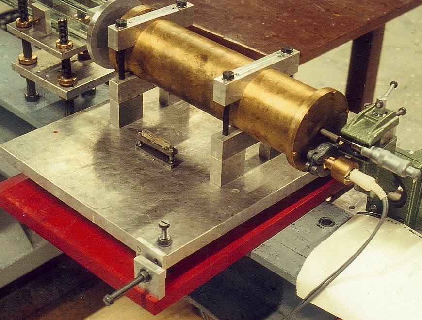 A copy of this drive ( see photo below) was later used on the first BS spectrometer at the FRMI. The micrometer device seen on the back of the drive was used to measure the maximum amplitude of the drive motion ( a few mm).