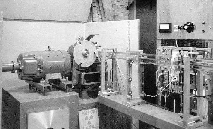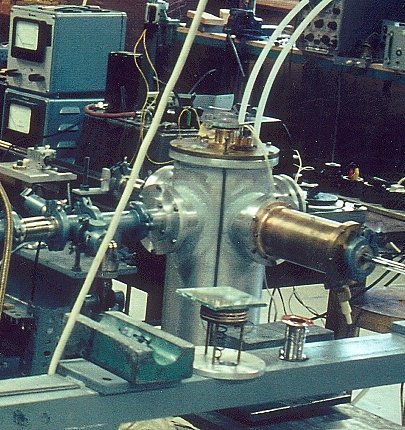 Therefore it was replaced later a ILL by an improved version of the Fichtel & Sachs drive from FRMI shown in the photo below: One sees the end of the neutron guide H15, the Si monochromator ( hexagonal structure) on an aluminum plate and behind the Doppler drive. The pickup coil to measure the velocity is also visible. Behind the neutron guide one sees the first cryofurnace for tests of the temperature scan of the BS monochromator ( about 1976).