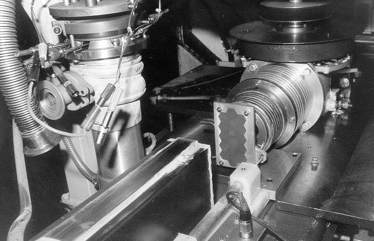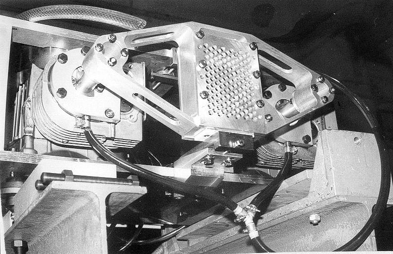 The next photo shows the drive developed by Alefeld for the first BS spectrometer in Jülich around 1970. It is a transparent drive using two modified lawn mover motors coupled together. The white beam traverses the BS monochromator mounted on a honey comb aluminum holder plate. A copy of this drive was installed on the first version of IN10. The drawback of the drive was its maximum speed limited to about 1 m/s.