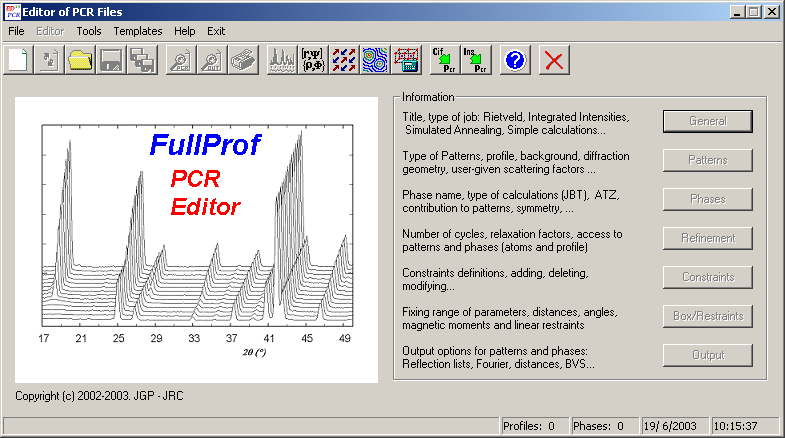 What is EdPCR? EdPCR is a graphical editor for the input PCR files for the FullProf program. EdPCR provides an easy and intuitive GUI to operate with FullProf. A beginner can access an existing PCR file without being concerned with all the intricacies of exposed variables and refinement codes. Experienced users can also modify by hand a particular variable by making use of the procided text editor within EdPCR, so all kind of users may take advantage of using EdPCR. An important feature of EdPCR is its capability to import CIF and SHELX files and generate automatically a PCR file adapted for simple calculations. The program EdPCR is distributed in the hope that it will be useful, but WITHOUT ANY WARRANTY of being free of internal errors. In no event will the authors be liable to you for damages, including any general, special, incidental or consequential damages arising out of the use or inability to use the program (including but not limited to loss of data or data being rendered inaccurate or losses sustained by you or third parties or a failure of the program to operate with any other programs). The authors are not responsible for erroneous results obtained with EdPCR. This manual cannot substitute the lack of knowledge of users on crystallography, magnetism, diffraction physics, and data analysis. The user must check his (her) data before claiming a malfunction of the program. The authors acknowledge all suggestions and notification of possible bugs found in the program or in the manual.